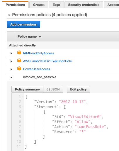 - IAM:PassRole / Inline policy – Needed when adding the InfoBlox Integration