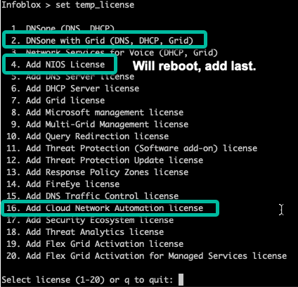 Take a 10 or 15 minute break as the instance boots and the Status Checks complete. SSH to the instance as admin with the default password of infoblox. Once logged in you will need to add some temporary licenses (Or permanent if you have them). Add the license options shown in this screen shot. When adding #4, select #2, IB-V825. This will force a reboot.