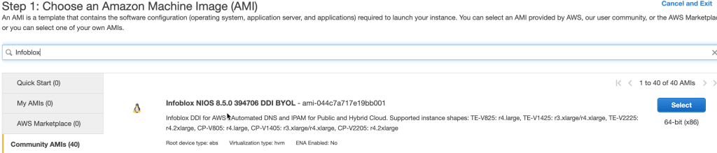 Now on to deploying the InfoBlox for AWS AMI. This deployment requires two subnets in the same availability zone. Detailed installation directions start on page 22 of the NVIOS for AWS document. Make sure to select one of the DDI BYOL AMI’s. I’m using ami-044c7a717e19bb001 for this blog. Here is a screen shot of the search of the community InfoBlox AMI’s.