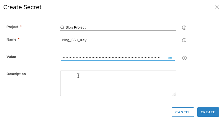 The first one will be the SSH key. Find your project, give it a name, then paste in the key. Click CREATE to save the values. Repeat the process for the Password secret.